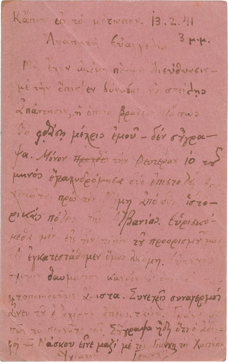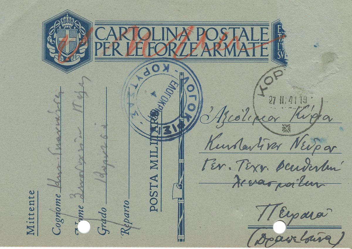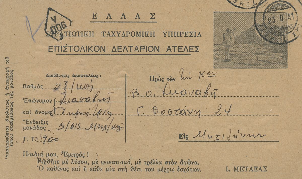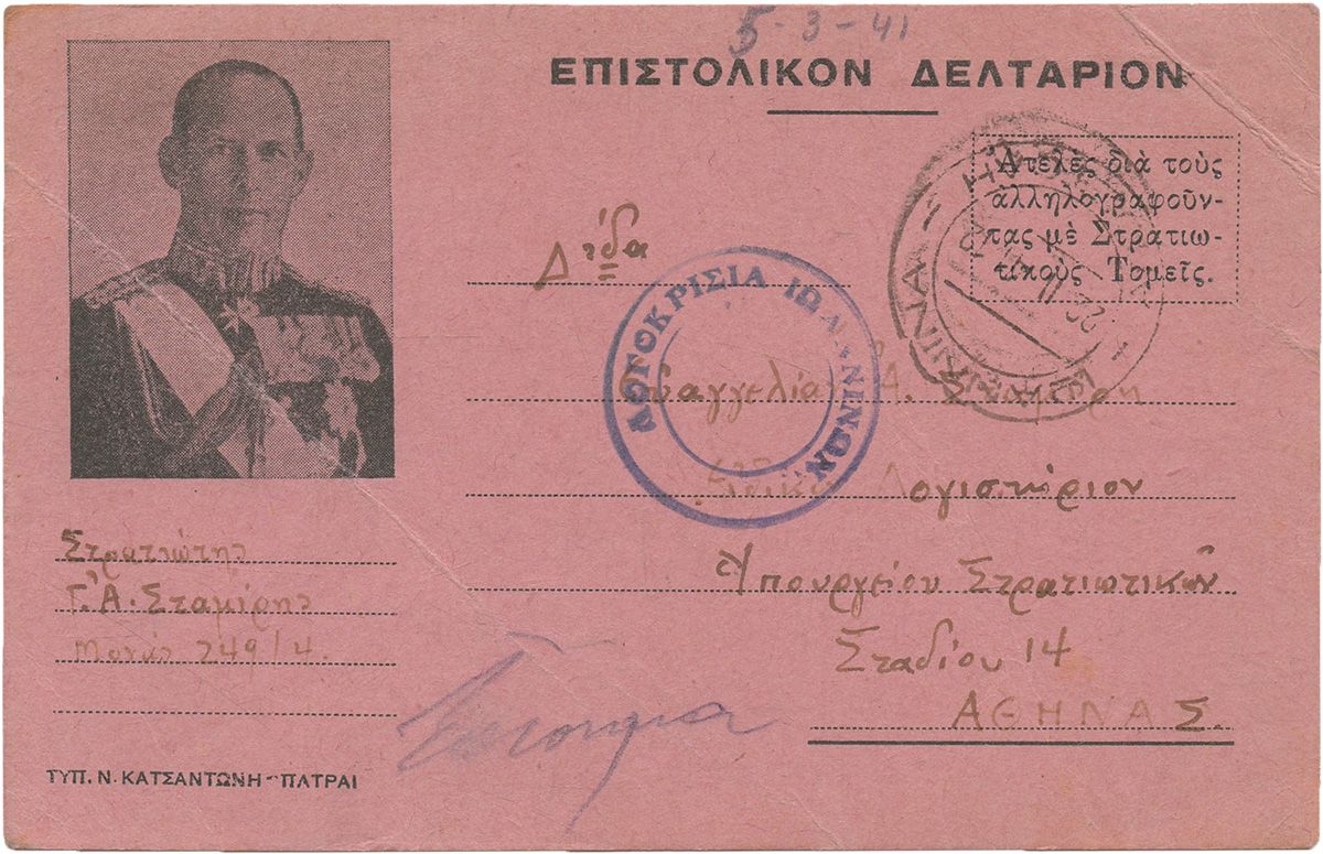 ΕΠΙΣΤΟΛΙΚΑ ΔΕΛΤΑΡΙΑ στρατιωτών και αξιωματικών προς φίλους και συγγενείς. Με σφραγίδες. Σε κάποια τρύπες από διακορευτή. Σε θήκες και σε ντοσιέ. (20)