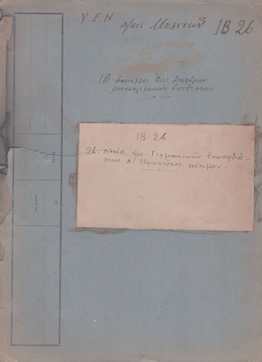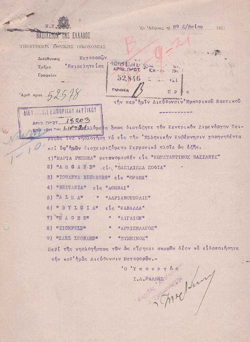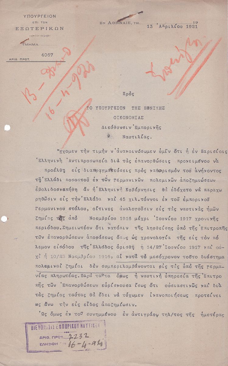 ΑΡΧΕΙΟ ΕΓΓΡΑΦΩΝ 1920-1922 σχετικό με τα παραχωρηθέντα στην Ελλάδα γερμανικά πλοία ως πολεμική αποζημίωση μετά τον Α’ ΠΠ. Σύμφωνα με τη Συνθήκη των Βερσαλλιών, η Γερμανία υποχρεώθηκε να παραδώσει μεγάλο μέρος του στόλου της στους Συμμάχους. Έγγραφα των Υπουργείων Εθνικής Οικονομίας, Εξωτερικών, Συγκοινωνιών, κατάλογος πλοίων, έκθεση της Επιτροπής Επανορθώσεων, τηλεγραφήματα, κ.ά.