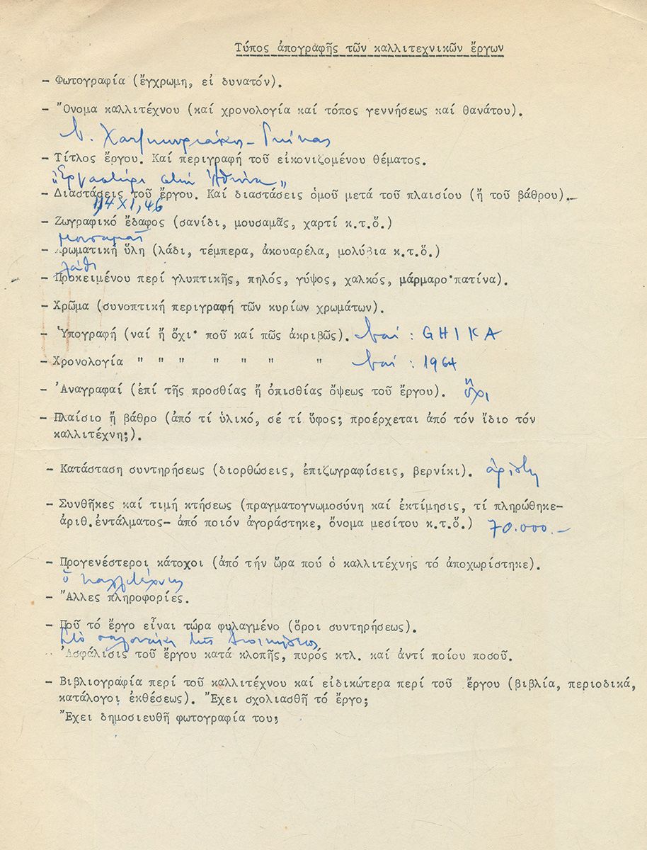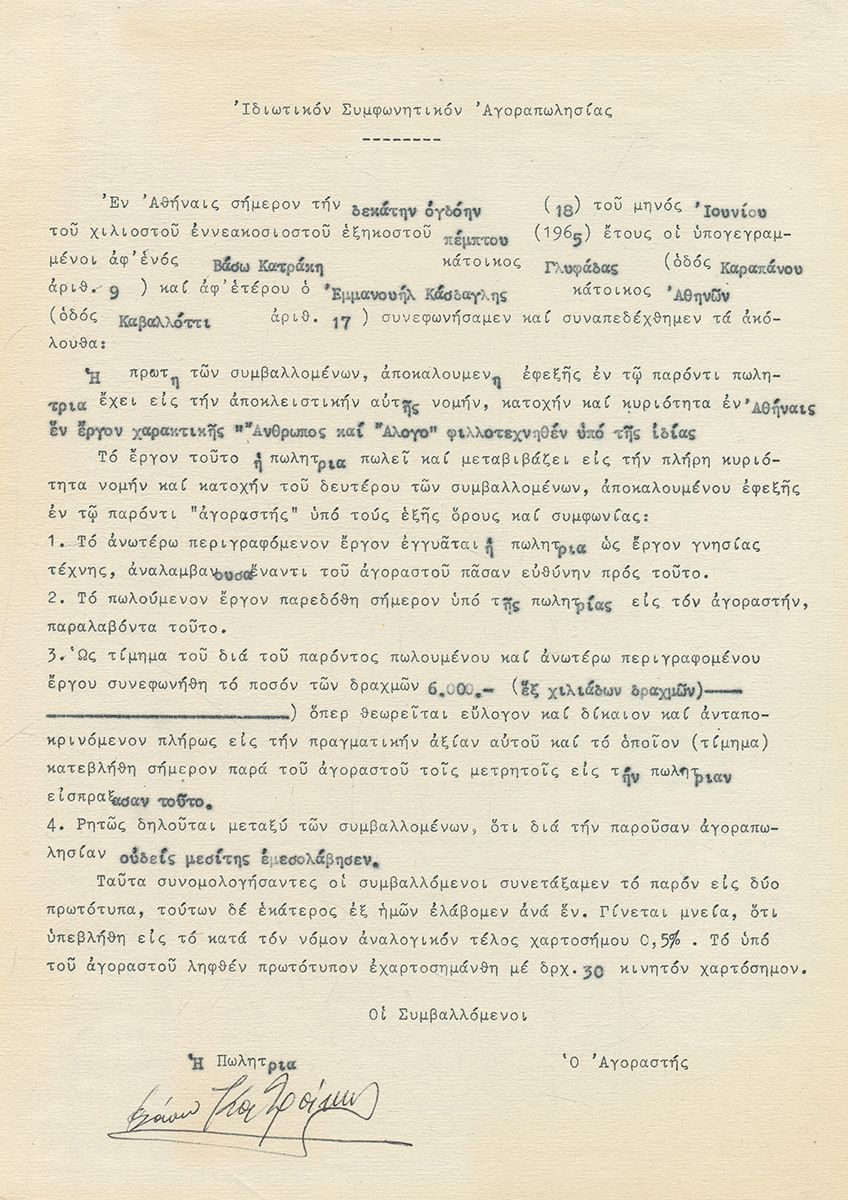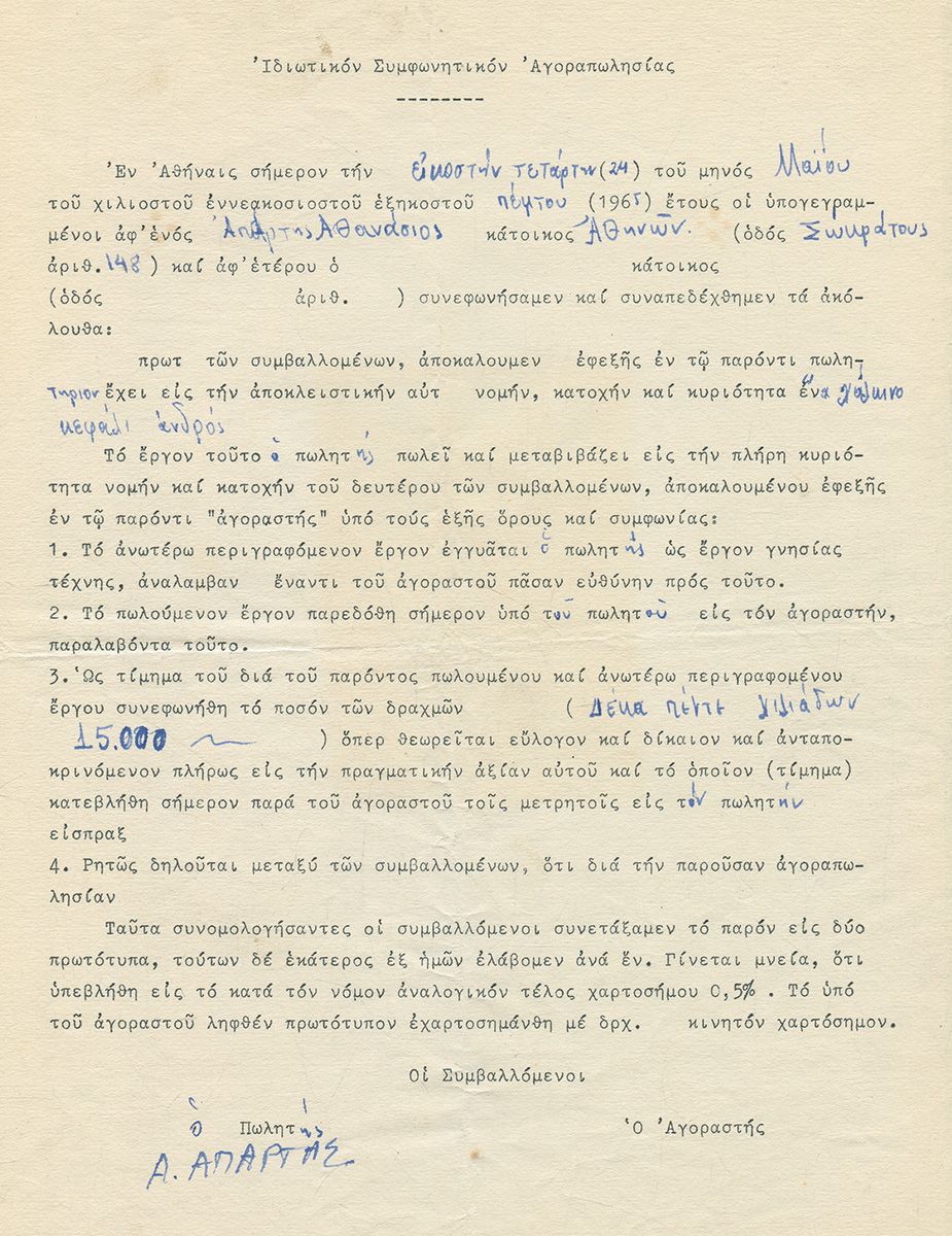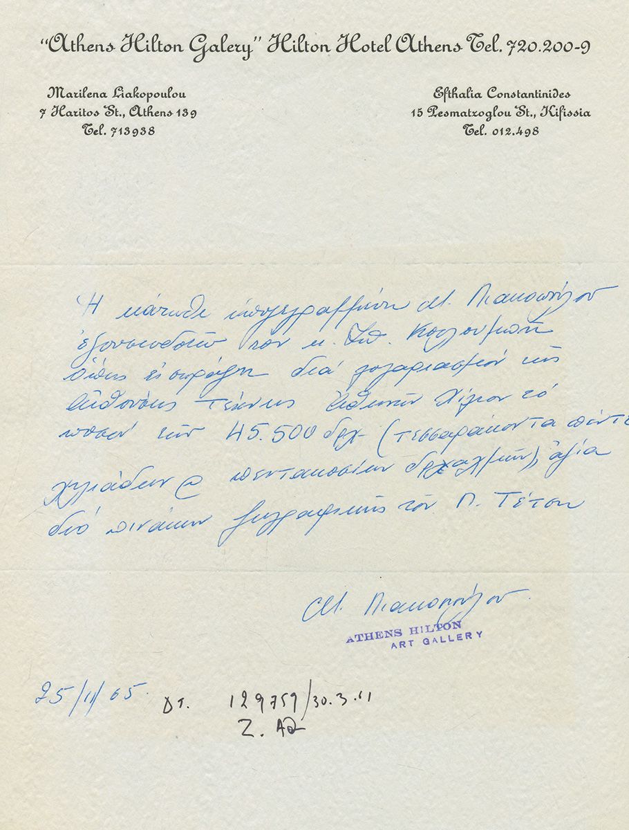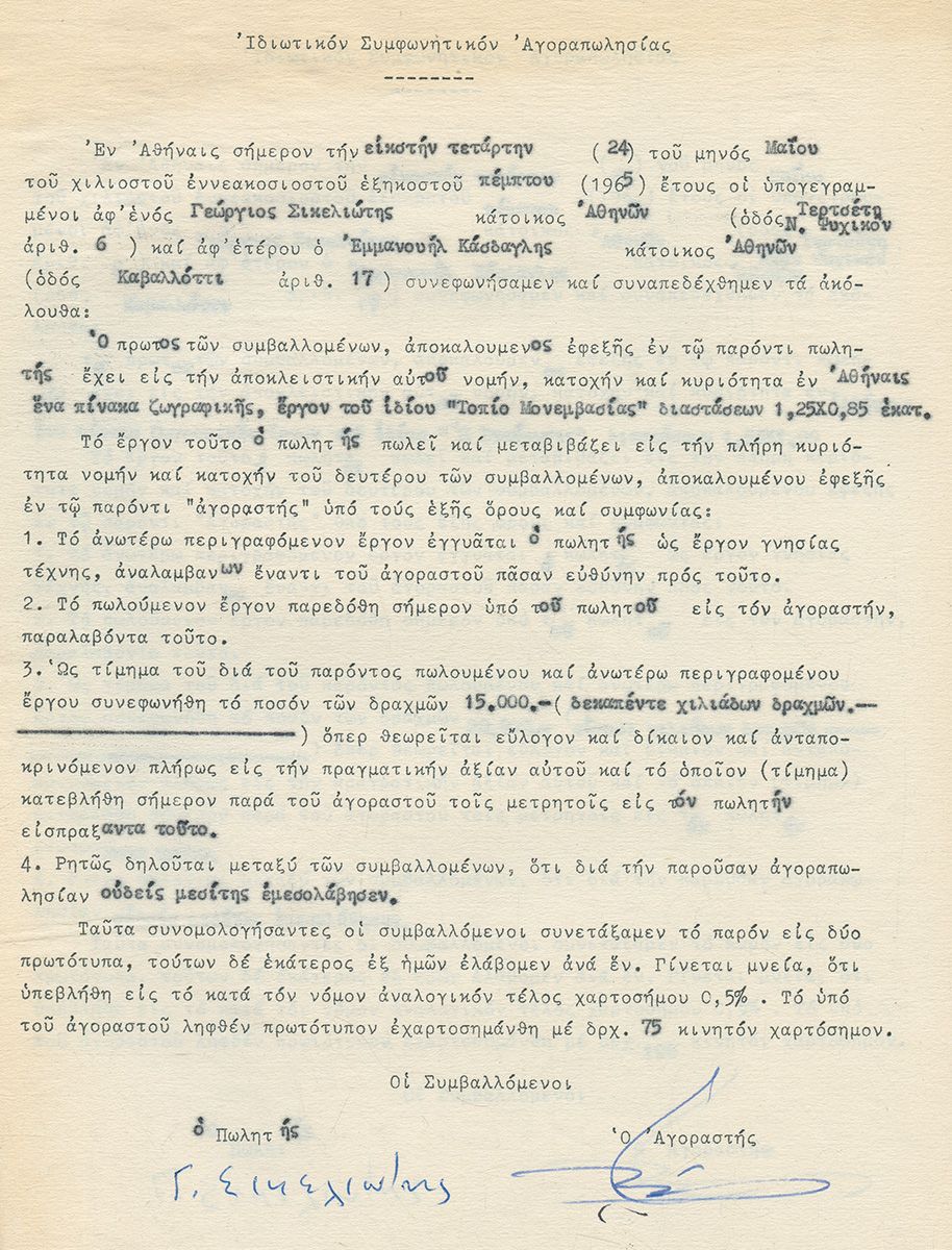 ΑΡΧΕΙΟ ΕΓΓΡΑΦΩΝ ΤΗΣ ΕΘΝΙΚΗΣ ΤΡΑΠΕΖΑΣ ΤΗΣ ΕΛΛΑΔΟΣ σχετικά με την αγορά πινάκων μεγάλων Ελλήνων ζωγράφων, 1965-1973. Ιδιωτικά συμφωνητικά αγοραπωλησίας μεταξύ των ζωγράφων και του Εμμανουήλ Κάσδαγλη, διευθυντή του Μορφωτικού Ιδρύματος της Εθνικής Τραπέζης, υπηρεσιακά σημειώματα, απογραφή των καλλιτεχνικών έργων, αποδείξεις, αποκόμματα εφημερίδων, αίτηση δανεισμού έργων από την Εθνική Πινακοθήκη, κ.ά. 12 φάκελοι: Τάσσος, Βάσω Κατράκη, Σικελιώτης, Βασιλείου, Γκίκας, Τσαρούχης, Άγγελος Θεοδωρόπουλος, Μαυροΐδης, Γιαννουκάκης, Βαρλάμος, Απάρτης, Τέτσης.