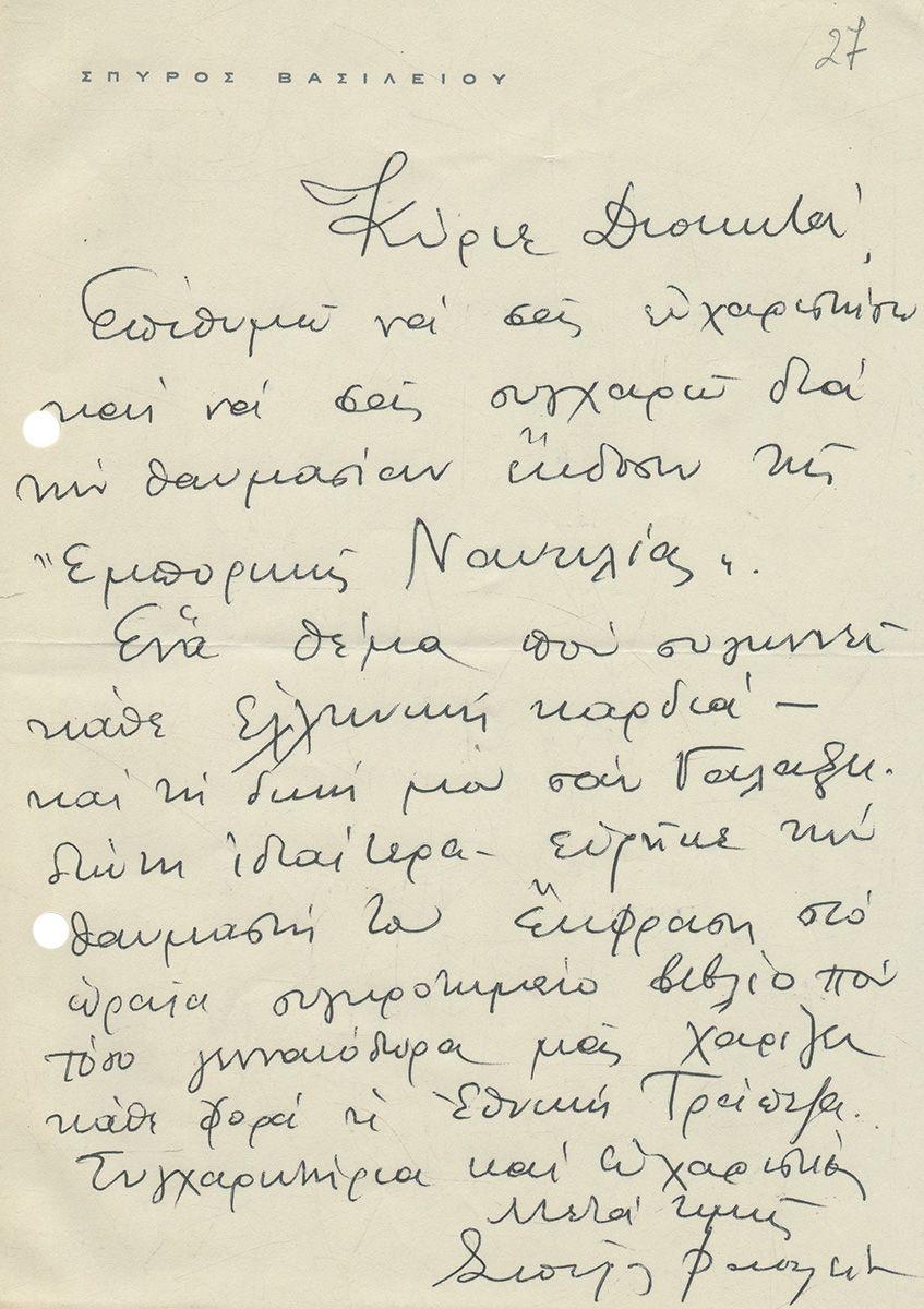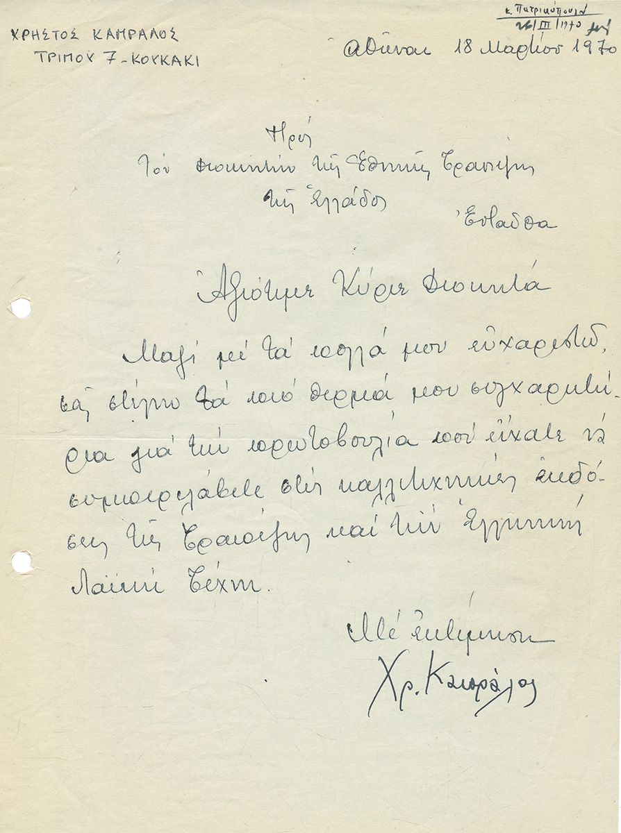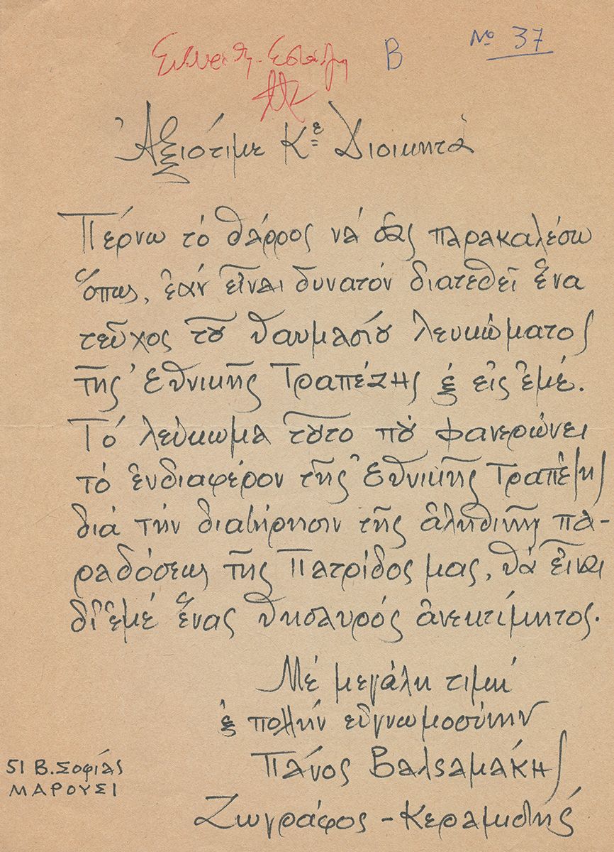 ΕΠΙΣΤΟΛΕΣ και cartes de visite σπουδαίων Ελλήνων καλλιτεχνών προς την Εθνική Τράπεζα σχετικές με τις εκδόσεις λευκωμάτων της. Δεκαετία 1970. Οι περισσότερες ιδιόχειρες και ιδιοχείρως υπογεγραμμένες. Ιωάννης Παππάς, Νικόλας, Μπαχαριάν, Μόσχος, Ταρσούλη, Τέτσης, Βασιλείου, Βαλσαμάκης, Μυταράς, Καπράλος, κ.ά. 11 cartes de visite & 21 επιστολές. (32)