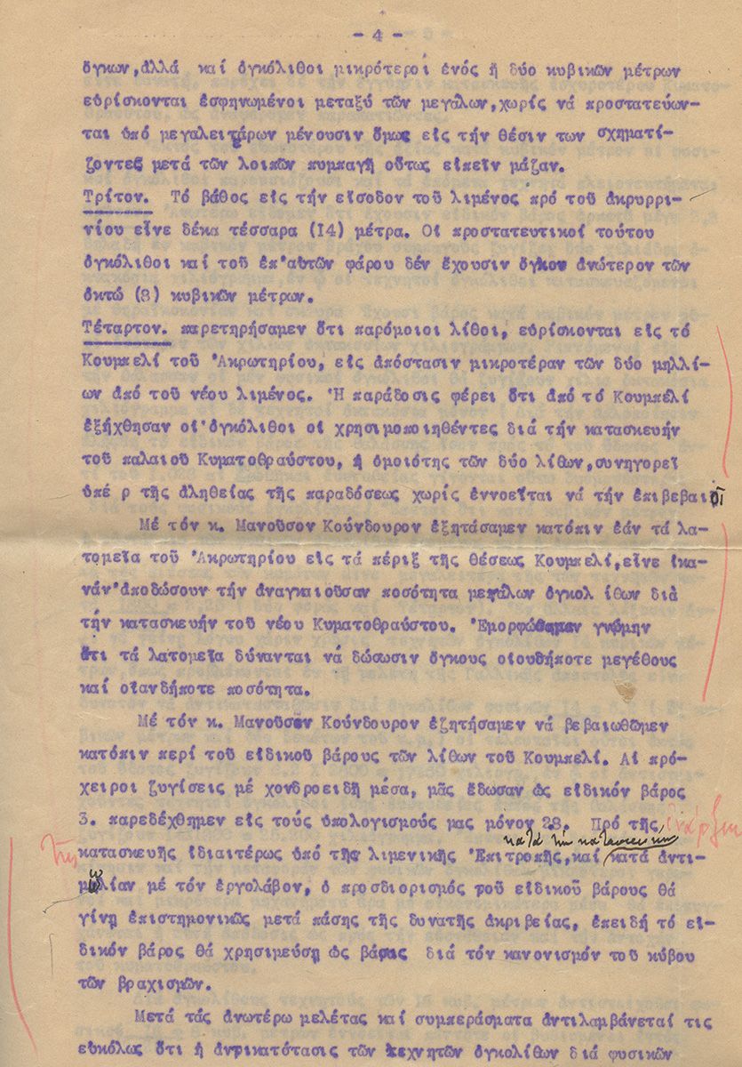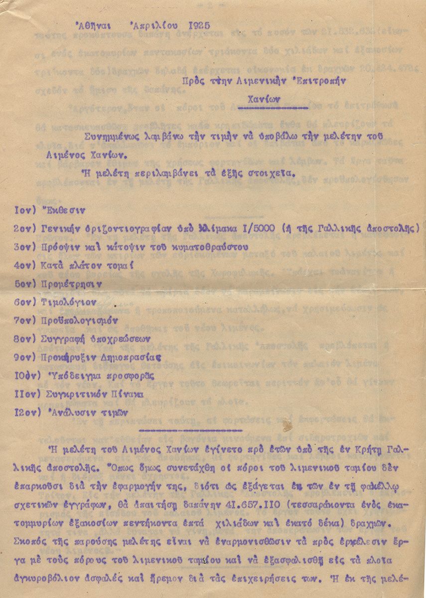 ΕΚΘΕΣΗ 10 σελίδων για την κατασκευή του λιμένος Χανίων. Αθήνα, Απρίλιος 1925. Με την υπογραφή του μηχανικού. [μαζί:] Γενική οριζοντιογραφία υπό κλίμακα 1/5000. [μαζί:] Χειρόγραφο σημείωμα μίας σελίδας για τις συνεδριάσεις της λιμενικής επιτροπής Χανίων όπου συζητήθηκε το ζήτημα του νέου λιμένος. (3)