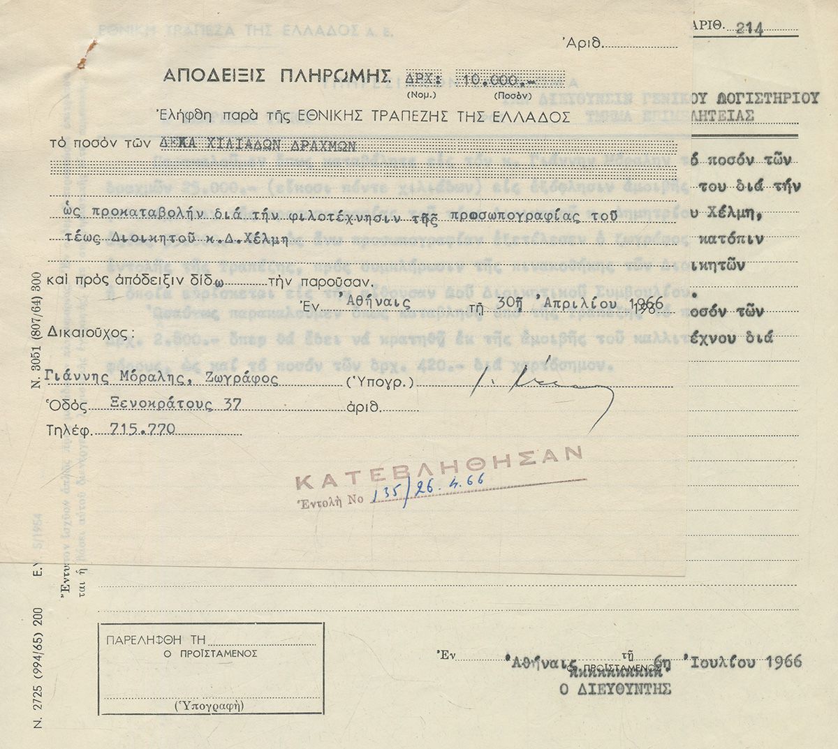 ΑΡΧΕΙΟ ΕΓΓΡΑΦΩΝ ΤΗΣ ΕΘΝΙΚΗΣ ΤΡΑΠΕΖΑΣ σεχτικά με την ανάθεση της φιλοτέχνησης των πορτρέτων πρώην διοικητών της τράπεζας από τον Γιάννη Μόραλη, 1966-1972: επιστολή αποδοχής του καλλιτέχνη με υπογραφή του, υπηρεσιακά σημειώματα και άλλα έγγραφα της τράπεζας, απόδειξη. [μαζί:] Δύο ευχαριστήριες επιστολές του καλλιτέχνη προς τον διοικητή της τράπεζας, σχετικά με την αποστολή λευκωμάτων-εκδόσεων του ιδρύματος. Η μία, 8 Απριλίου 1970, δακτυλογραφημένη με ιδιόχειρη υπογραφή. Η δεύτερη, 3 Ιουνίου 1974, χειρόγραφη και υπογεγραμμένη.